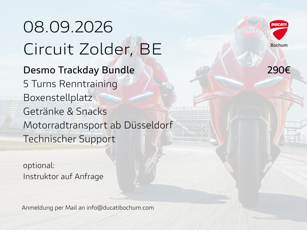 Achtung: Die Plätze sind begrenzt, daher nicht lange warten! Zur Reservierung eines Platzes auf der Warteliste einfach eine Mail an info@ducatibochum.de schicken. Die verbindliche Anmeldung folgt danach. Für diese Veranstaltung gibt es kein dB-Limit.